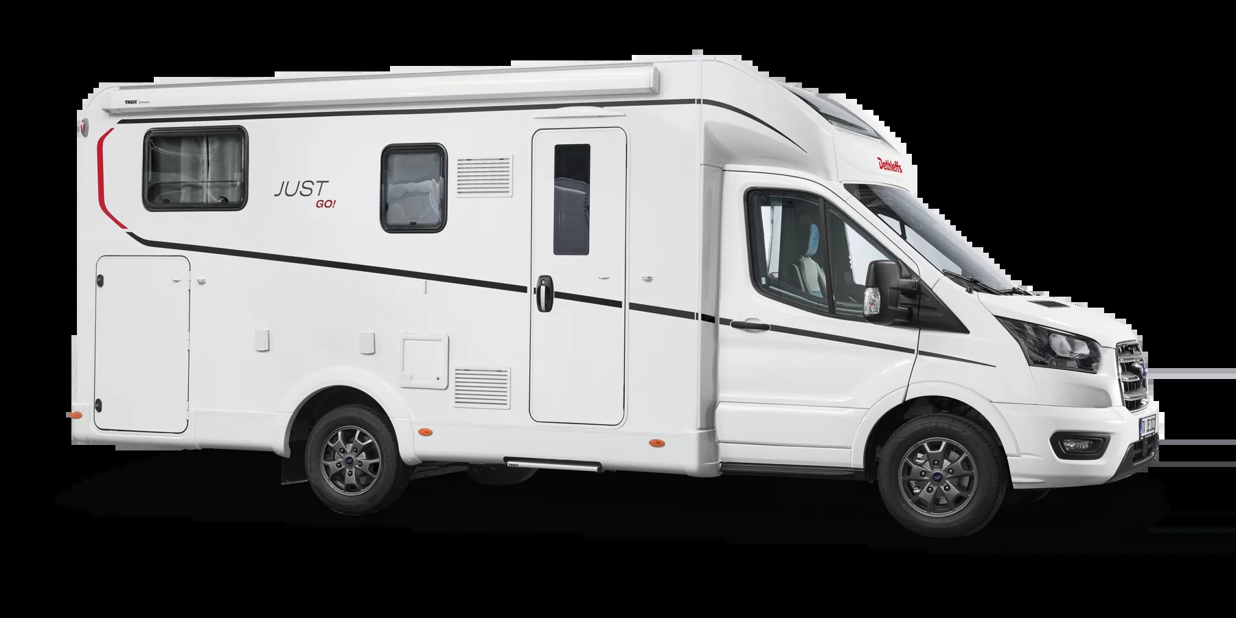 Dethleffs Just Go T 7055 DBL to przestronny kamper low-profile (półzintegrowany) oparty na podwoziu Ford Transit, który oferuje wysoki komfort podróżowania w kompaktowych rozmiarach poniżej 7,5 m długości.