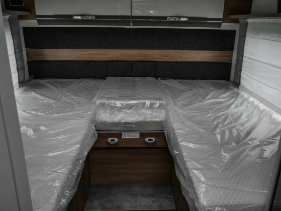 - Elektryczne opuszczane łóżko w poprzek siedziska („Panoramiczna maska dachowa 70x50 cm w części mieszkalnej” jest połączona z opcją „Elektrycznie opuszczane łóżko nad grupą siedzeń” w części sypialnej.)