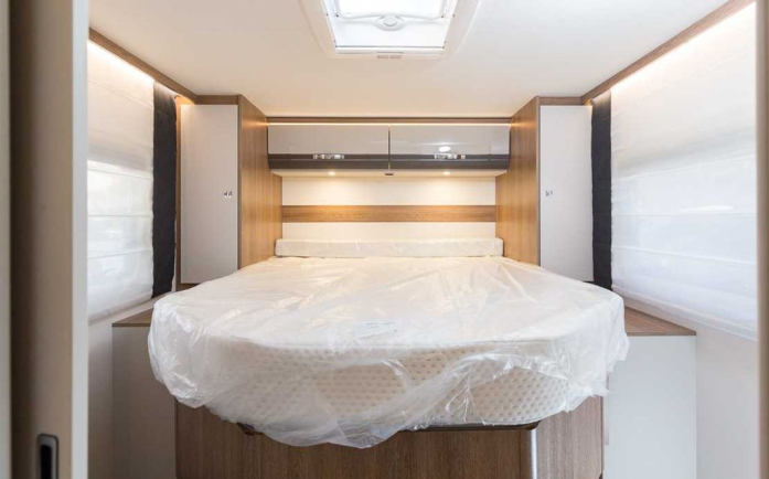 - Elektryczne opuszczane łóżko w poprzek siedziska („Panoramiczna maska dachowa 70x50 cm w części mieszkalnej” jest połączona z opcją „Elektrycznie opuszczane łóżko nad grupą siedzeń” w części sypialnej.)