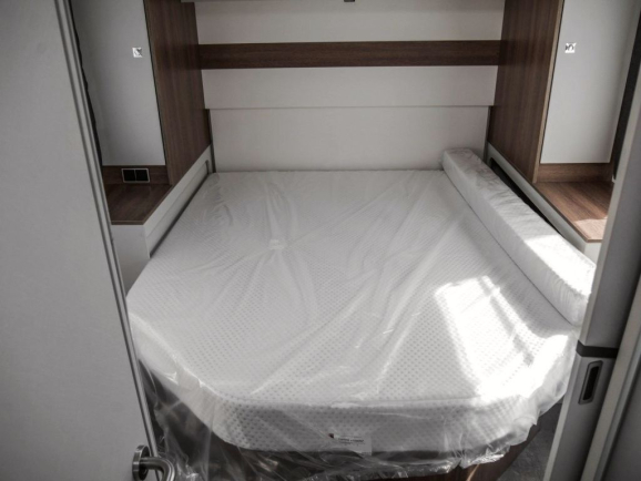 • Elektryczne opuszczane łóżko w poprzek siedziska („Panoramiczna maska dachowa 70x50 cm w części mieszkalnej” jest połączona z opcją „Elektrycznie opuszczane łóżko nad grupą siedzeń” w części sypialnej.)