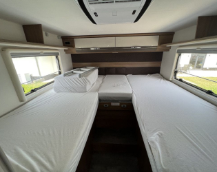 - Pakiet Family („Panoramiczna maska dachowa 70x50 cm w części mieszkalnej” jest połączona z opcją „Elektrycznie podnoszone łóżko nad grupą siedzeń” w części sypialnej.)