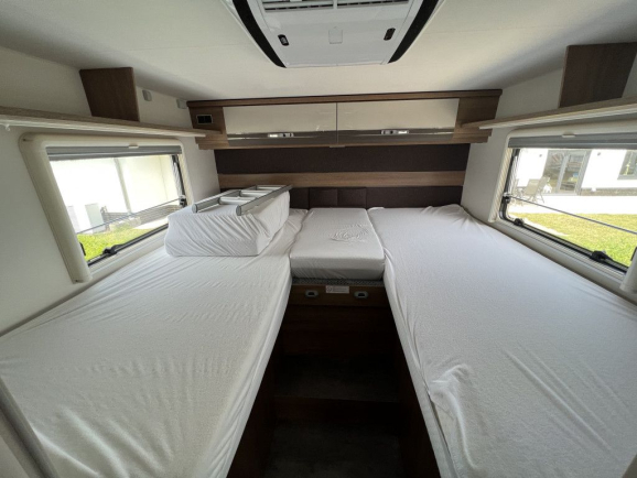 - Pakiet Family („Panoramiczna maska dachowa 70x50 cm w części mieszkalnej” jest połączona z opcją „Elektrycznie podnoszone łóżko nad grupą siedzeń” w części sypialnej.)
