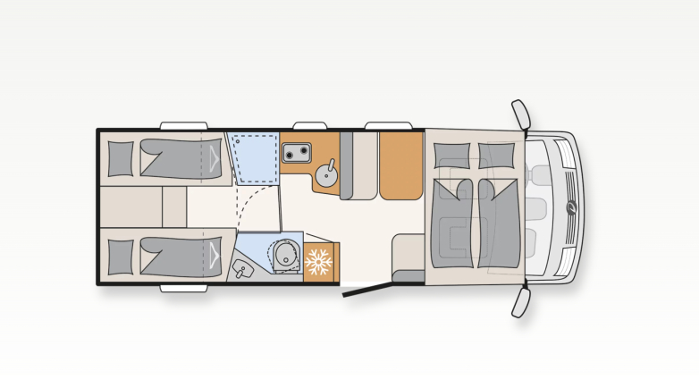 Niezakłócony sen: we wszystkich stałych łóżkach firma Dethleffs stosuje materace 7-strefowe o grubości 15 cm wykonane z materiału regulującego temperaturę. Łóżka pojedyncze mają długość min. 195 cm i opcjonalnie można je przebudować do dużej powierzchni do spania • T/I 7057 DBL