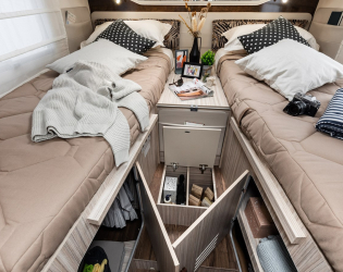 Maksymalny komfort, bez kompromisów, odpowiedni zarówno dla par, jak i cztero- lub pięcioosobowej rodziny. Pomieszczenia mieszkalne są nowoczesne, eleganckie i dobrze zaprojektowane. Detale wysokiej klasy, takie jak profile LED oraz chromowane wykończenie uchwytów. Przytulna atmosfera wita Cię wyborem ciepłych tonów i błyszczących wykończeń paneli, meblościanek i stołu. Funkcjonalny w swoich rozwiązaniach mieszkaniowych, zaskakuje wewnętrznym komfortem mieszkania, wieloma rozwiązaniami racjonalizującymi przestrzeń wewnętrzną. Gama T-Loft składa się z 5 różnych układów, wszystkie dla modeli niskoprofilowych.