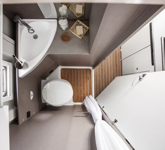 - Kompaktowa łazienka: Łazienka zintegrowana z prysznicem i toaletą kasetową zapewnia wygodę podczas podróży.