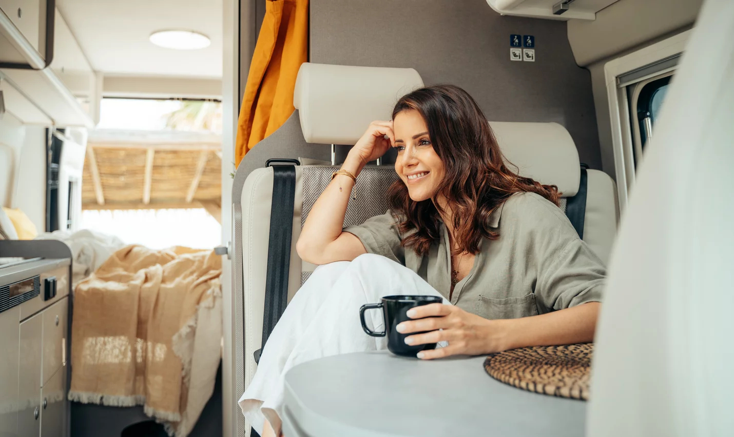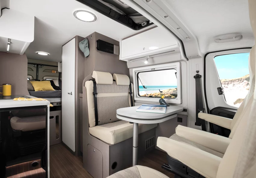 - Funkcjonalne wnętrze: Dzięki przemyślanemu układowi, kamper oferuje przestronną strefę dzienną z obrotowymi fotelami kierowcy i pasażera, co umożliwia wygodne spożywanie posiłków przy rozkładanym stole.