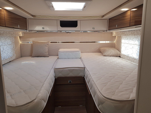• Układ z łóżkami pojedynczymi z regulowaną ramą z listew i wysuwanym przedłużeniem umożliwiającym konwersję na łóżko podwójne