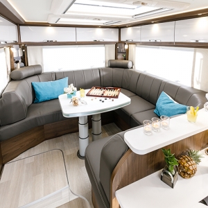 - Żywica syntetyczna MiracleWhite na blat kuchenny, panel kuchenny i osłonę boczną (jeśli jest), blat łazienkowy i pod standardowym miejscem TV (jeśli jest). Zamiast standardowego materiału (HPL). Należy pamiętać, że pozostałe powierzchnie będą wykonane z materiału zgodnie z wybranym "living worlds" lub indywidualnym wystrojem wnętrza. Uwaga: ślady zarysowań i codziennego użytkowania są nieuniknione podczas zwykłego użytkowania, a w przypadku dekorów o wysokim połysku i intensywnych kolorach stają się one bardziej widoczne w porównaniu z innymi dekorami.