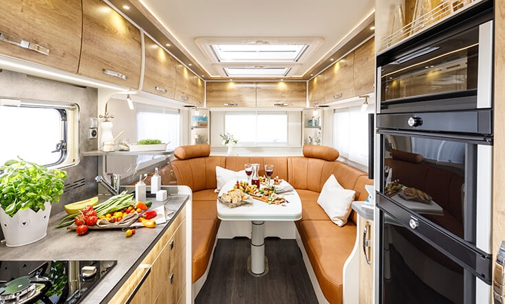 - Żywica syntetyczna Miracle White na blat kuchenny, panel kuchenny i osłonę boczną (jeśli jest), blat łazienki i pod standardowym miejscem TV (jeśli jest). Zamiast standardowego materiału (HPL). Należy pamiętać, że pozostałe powierzchnie będą wykonane z materiału zgodnie z wybranym "living world" lub indywidualnym wystrojem wnętrza. Uwaga: ślady zarysowań i codziennego użytkowania są nieuniknione podczas zwykłego użytkowania, a stają się one bardziej widoczne w przypadku dekorów o wysokim połysku i intensywnych kolorach w porównaniu z innymi dekorami.