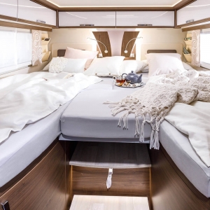 Tyle elastyczności – tak bardzo FRANKIA: Więcej miejsca do spania wzdłuż czy więcej miejsca w części wypoczynkowej? Podróżni mogą wybierać między dwoma układami wnętrza: FRANKIA NEO MT 7 BD z poprzecznym łóżkiem z tyłu i dodatkowym bocznym siedzeniem w nowej, przestronnej grupie siedzeń w kształcie litery L lub FRANKIA NEO GDK z wygodnymi podwójnymi łóżkami.