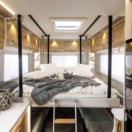 Wygodne wzdłużne łóżka pojedyncze, które opcjonalnie można łatwo przekształcić w łóżko podwójne, luksusowe łóżko typu queen-size lub opcjonalne składane łóżko z tyłu nad okrągłą grupą siedzeń - śpij tak, jak chcesz. Naprawdę można się zrelaksować w imponująco dużej części wypoczynkowej w tylnej części pojazdu. Podwójna podłoga o wysokości 35 cm oraz liczne szuflady i szafki zapewniają również dużo miejsca do przechowywania całego sprzętu podróżnego. Wysokiej jakości technologia pozwala na niezależną podróż przez szczególnie długi czas – zwłaszcza, aby natura stała się Twoim domem.