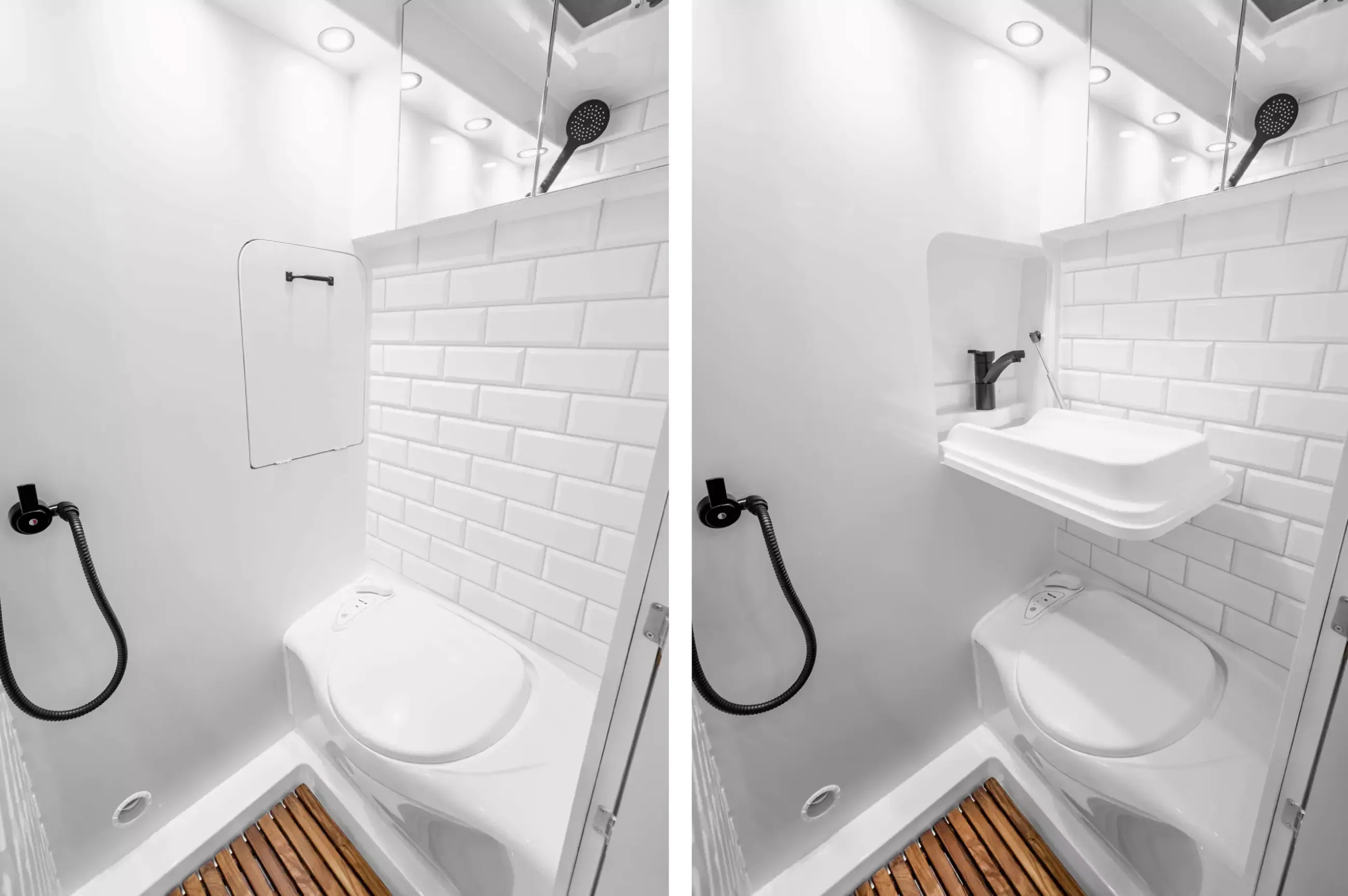 Łazienka: toaleta kasetowa, prysznic, umywalka — pełna „mokrołazienka”