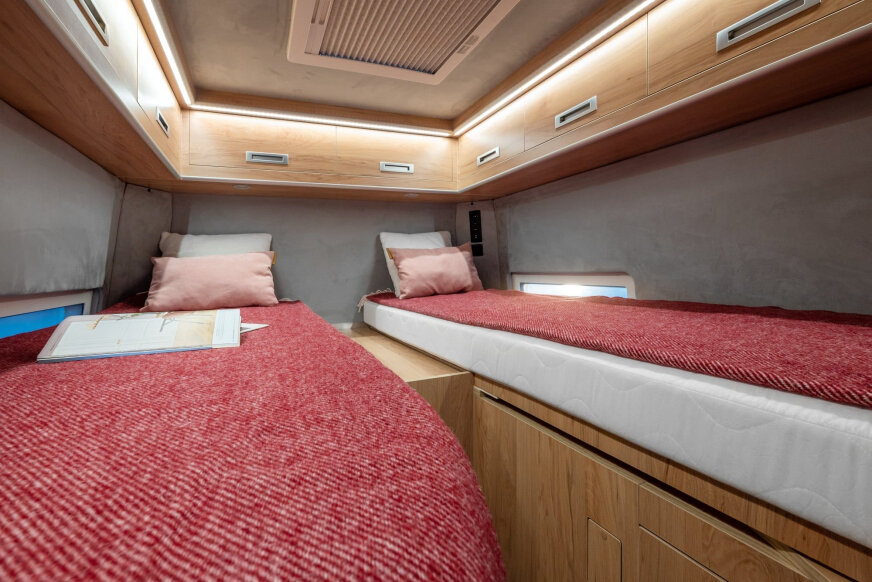 - Rozkładane łóżka są częścią wyposażenia standardowego wszystkich modeli Pathfinder oraz Voyager. To, co na pierwszy rzut oka wygląda jak zwykła szafka, z łatwością zmienia się w miejsce do spania (187 x 134 cm), pod którym można wygodnie siedzieć przy stoliku. Co ważne, rozkładanie i składanie nie wymaga wysiłku.