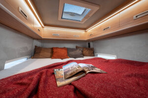 - Dzięki modyfikacji dachu, wewnątrz pojazdu zamontowane zostało dodatkowe, rozkładane łóżko. Nawet gdy jest rozłożone, można wygodnie korzystać z jadalni. Wszystkie modele w seriach Voyager i Pathfinder z tą adaptacją dachu mają po 300 cm wysokości. Wysokość wnętrza, liczona od podłogi do sufitu to 210 cm w okolicach stolika i 195 cm w tylnej części wnętrza.