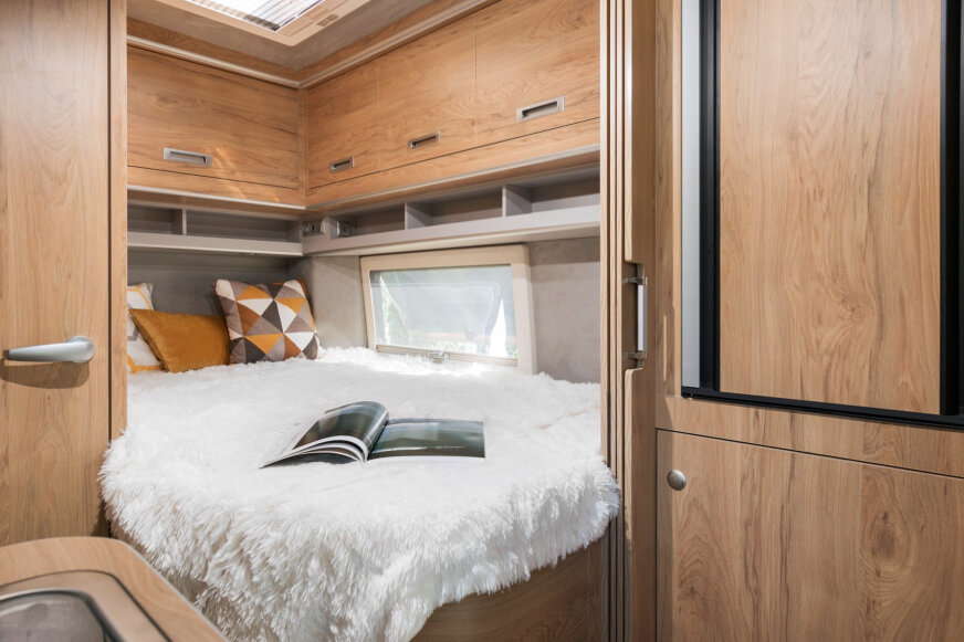 - Rozkładane łóżka są częścią wyposażenia standardowego wszystkich modeli Pathfinder oraz Voyager. To, co na pierwszy rzut oka wygląda jak zwykła szafka, z łatwością zmienia się w miejsce do spania (187 x 134 cm), pod którym można wygodnie siedzieć przy stoliku. Co ważne, rozkładanie i składanie nie wymaga wysiłku.