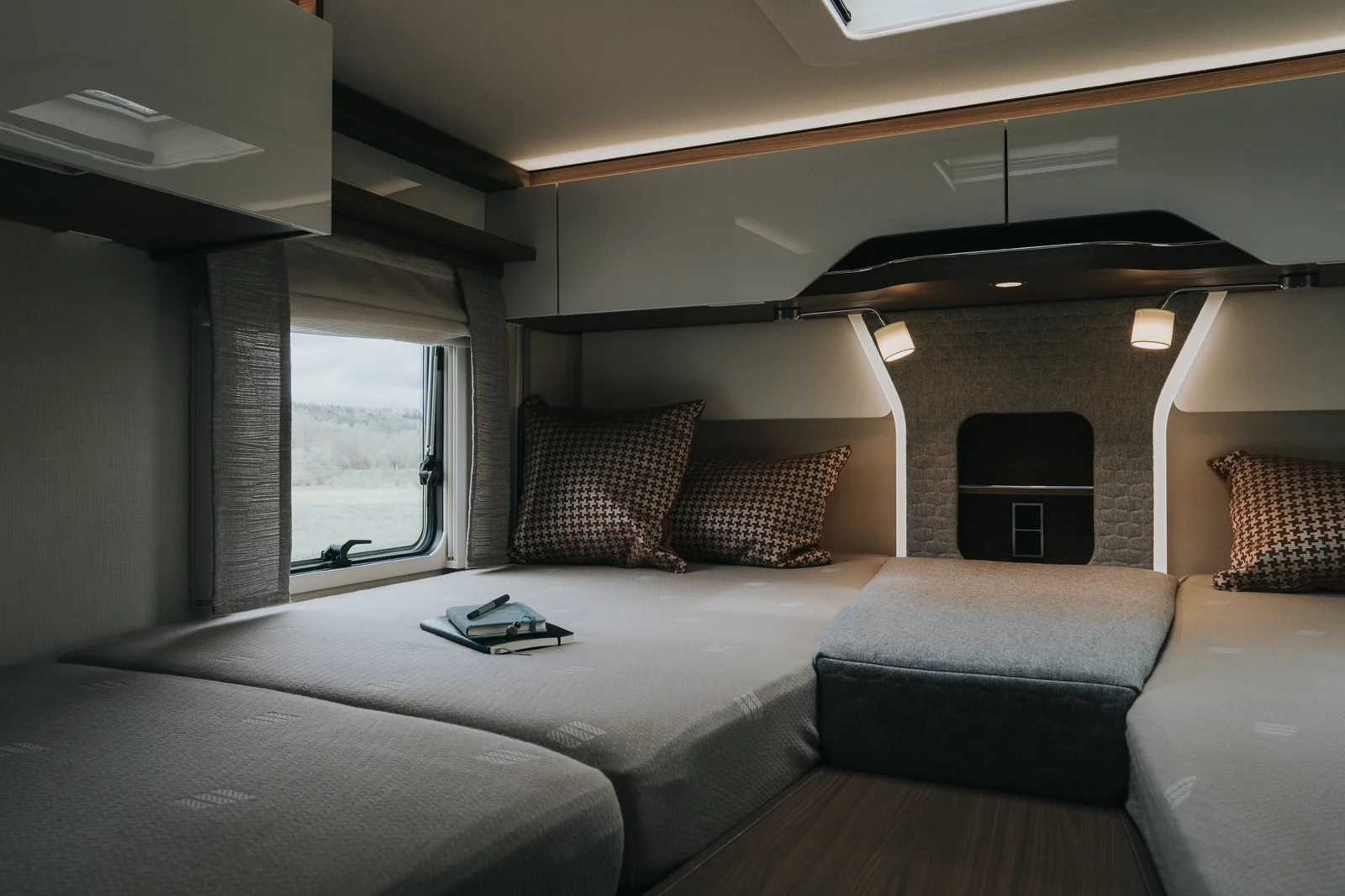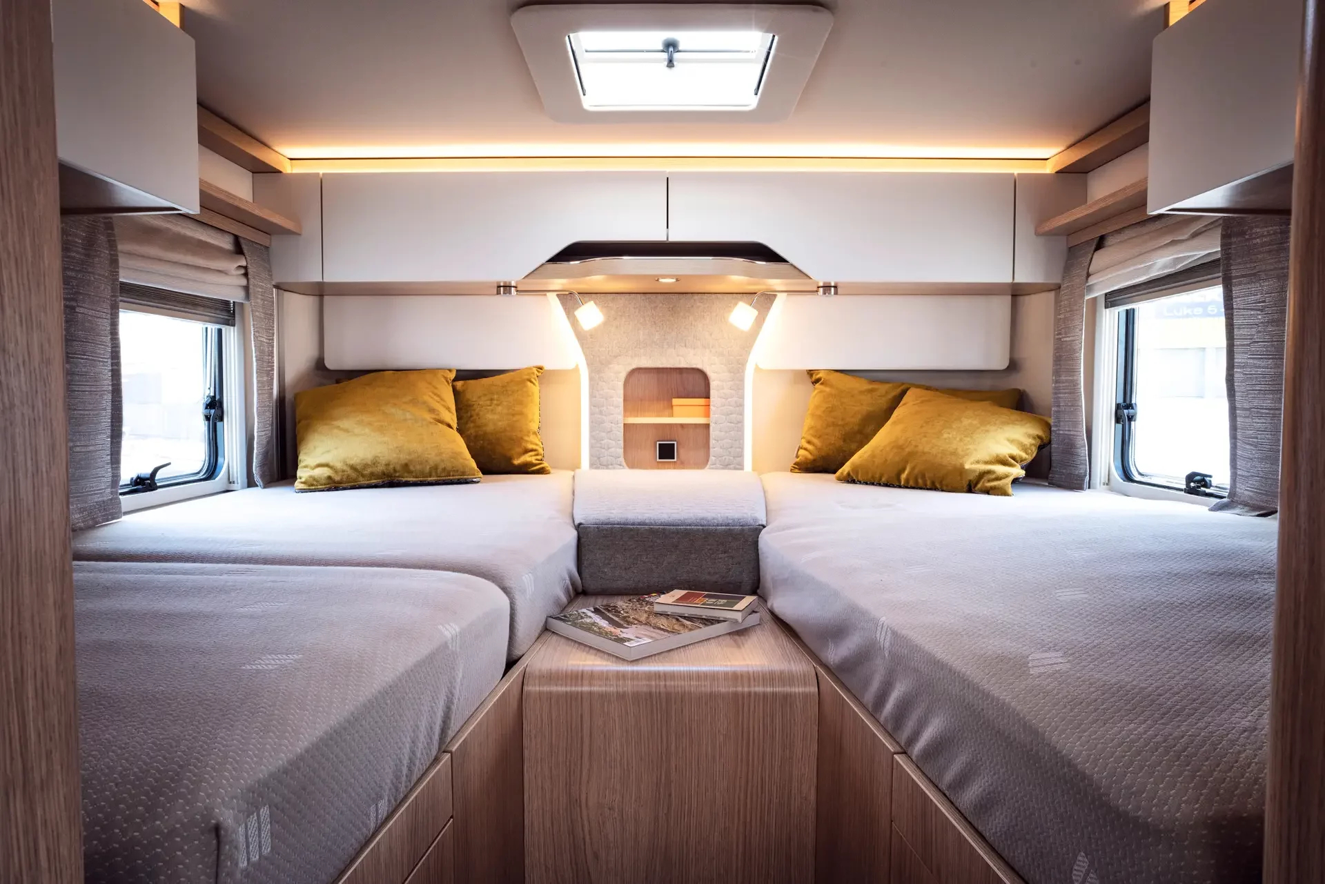 Łóżko tylne: wybór spośród łóżek pojedynczych, queen bed lub „French bed” — komfort przestrzenny.