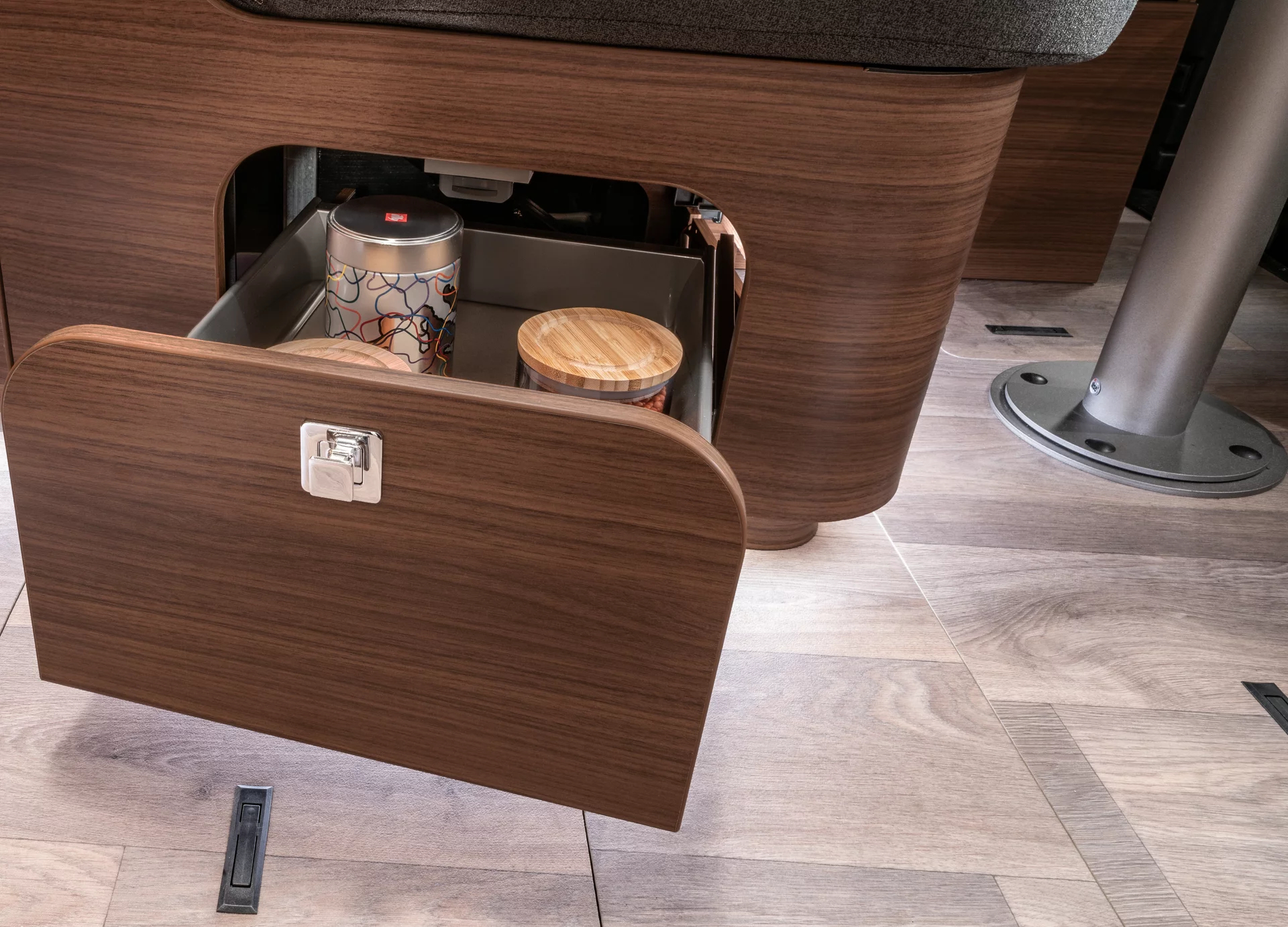 Kuchnia: wyposażona w dwa palniki, lodówkę min. 153 l z zamrażalnikiem, rozkładany blat i system przechowywania „Multiflex”.