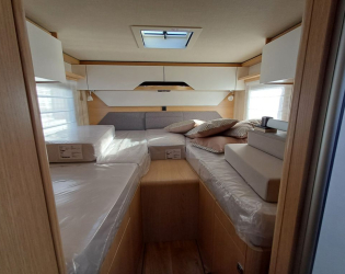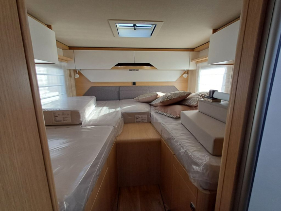 - Opuszczane podwójne łóżko nad częścią wypoczynkową z materacem z zimnej pianki (wersja elektryczna) zintegrowane z dachem (W salonie nie montuje się panoramicznego świetlika dachowego. Przy zamówieniu opuszczanego podwójnego łóżka nad częścią wypoczynkową maksymalna długość markizy wynosi 4 m. W B-MC T 550 opuszczane łóżko nie współpracuje z relingami dachowymi)