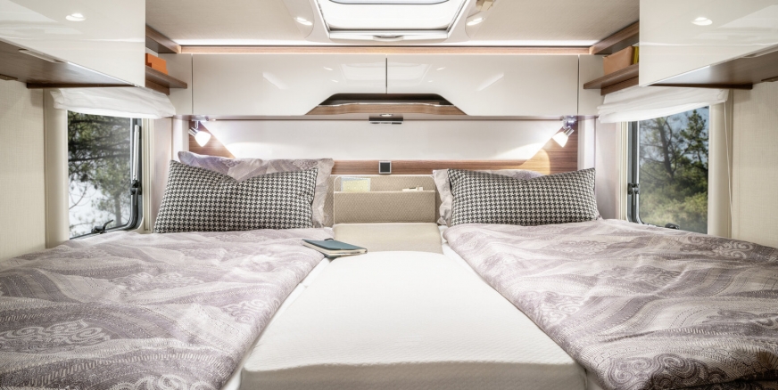 - Szafki z przodu zamiast rozkładanego łóżka (w tym świetlik nad kuchnią)
