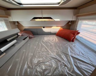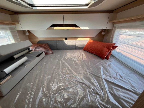 • Elektrycznie opuszczane łóżko podwójne nad częścią wypoczynkową z materacem z zimnej pianki, łącznie z integracją z dachem