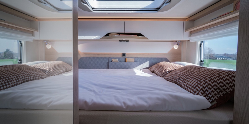 - Opuszczane podwójne łóżko nad częścią wypoczynkową z materacem z zimnej pianki (wersja elektryczna), w tym integracja z dachem