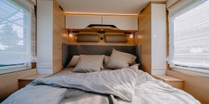- Opuszczane podwójne łóżko nad częścią wypoczynkową z materacem z zimnej pianki (wersja elektryczna), w tym integracja z dachem