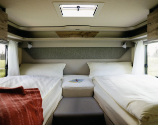 - Świetlik od frontu z roletą zaciemniającą i moskitierą 40 x 40 cm (Okno dachowe 40 x 40 cm nie jest dostępne w połączeniu z opcjonalnymi schowkami górnymi z przodu zamiast opuszczanego łóżka.)