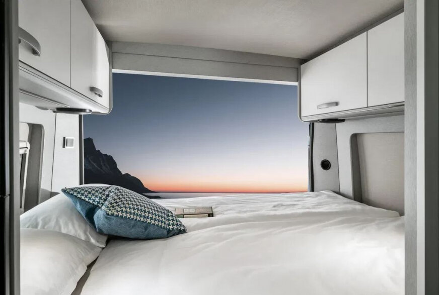 - Fotele kierowcy i pasażera z podłokietnikami i kanapa tapicerowane tkaniną zastosowaną w części dziennej
