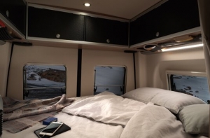 - Fotele kierowcy i pasażera, podłokietniki i kanapa tapicerowane tkaniną u użytą w części dziennej