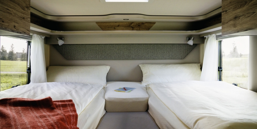 - Konstrukcja łóżka z komfortowej grupy siedzeń w kształcie litery L z dodatkową tapicerką i opuszczanym stołem wraz z siedzeniem kierowcy