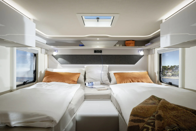 - Opuszczane podwójne łóżko nad częścią wypoczynkową z materacem z zimnej pianki, elektrycznym (Wybierając tę opcję, zamiast świetlika panoramicznego 80 x 50 w części mieszkalnej montuje się świetlik o wymiarach 40 x 40 cm.)