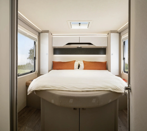 • Opuszczane podwójne łóżko nad częścią wypoczynkową z materacem z zimnej pianki, elektrycznym (Wybierając tę opcję, zamiast świetlika panoramicznego 80 x 50 w części mieszkalnej montuje się świetlik o wymiarach 40 x 40 cm.)