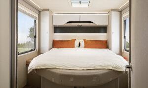 - Opuszczane podwójne łóżko nad częścią wypoczynkową z materacem z zimnej pianki (wersja elektryczna)