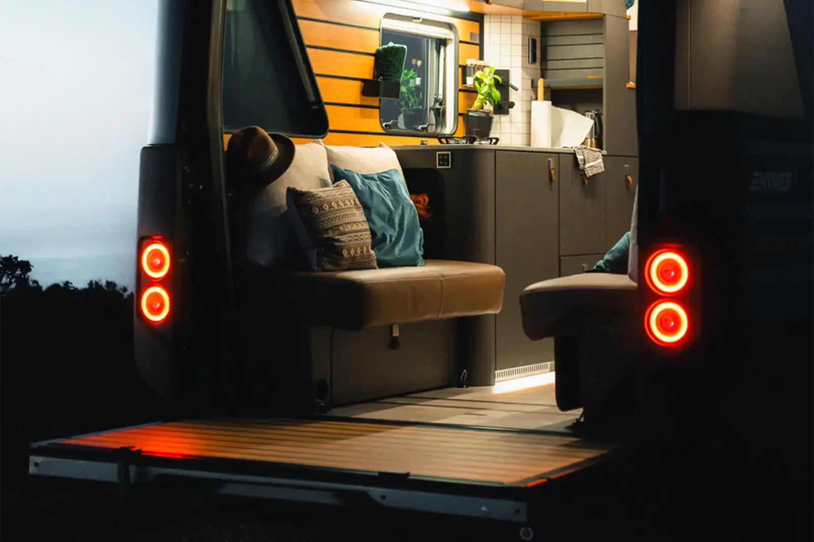 Biuro mobilne: składany stolik, źródła zasilania, oświetlenie – stworzono miejsce do pracy „on-the-go”.