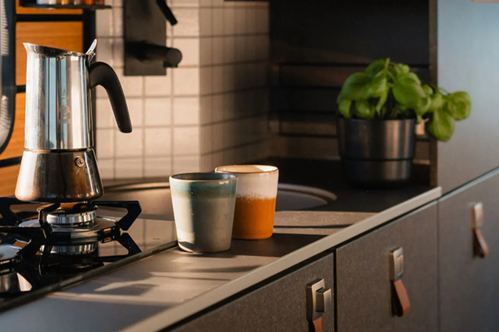 Kuchnia: blat FENIX, rozkładane elementy robocze, tapicerowane wnętrze, systemy ładowania bezprzewodowego i schowki na smartfony.