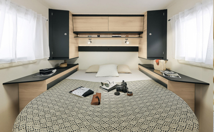 - Łóżko stałe z ręczną regulacją wysokości od wewnątrz (≈ 20 cm), z elektrycznymi siłownikami podnoszącymi - opcja (Francja) / standard (pozostałe kraje)