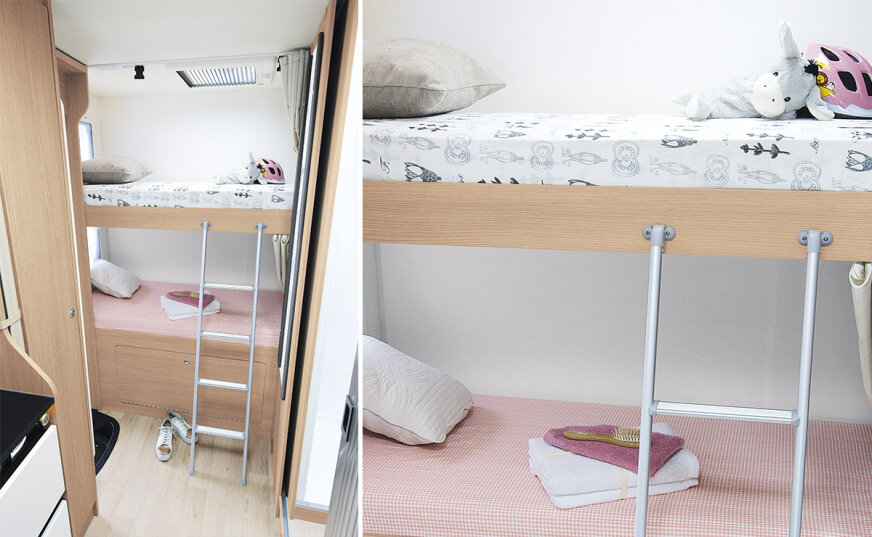 • Stałe łóżko z aluminiową ramą podstawy i aktywnymi wielowarstwowymi listwami, z bardzo wytrzymałym materacem piankowym Bultex® - standard