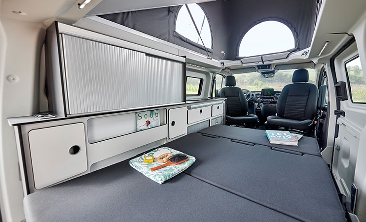 - Przesuwana 3-osobowa tylna ławka z przebudową na łóżko
