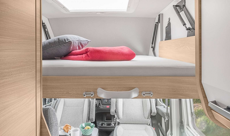 - Klasyczne przednie łóżko podnoszone, ręczne (brak szafek sufitowych w jadalni – brak schowka nad kabiną!) - standardowo