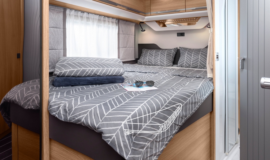 SKY WAVE 60 LAT przyciąga uwagę wszystkich. Specjalne naklejki w eleganckich odcieniach szarości uzupełnia ekskluzywna grafika 60 LAT na bocznej ścianie. Nowoczesne wnętrze i standardowo składane łóżko sprawiają, że jest to idealny model półzintegrowany ze składanym łóżkiem.