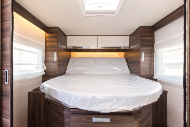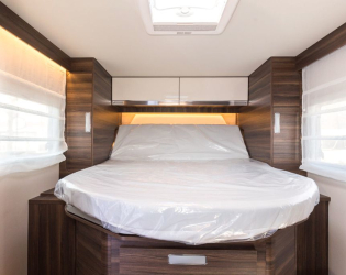 - Łóżko opuszczane elektrycznie (Panoramiczny świetlik zostaje zastąpiony świetlikiem 40x40 cm, gdy opuszczane łóżko jest montowane nad salonem), cm: 186x139 (opcja)
