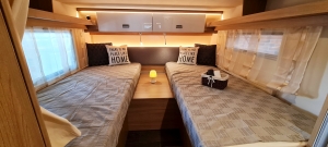 - Przednie opuszczane łóżko z listew i bardzo wygodnym materacem, wyszukana markiza, okno dachowe z przezroczystą kopułą, podwójne lampki do czytania, półka i zasłona oddzielająca dla maksymalnej prywatności