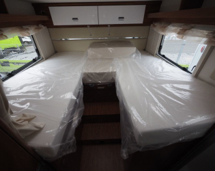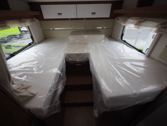 - Opuszczane łóżko z listwami i materacem o wysokim komforcie, dodatkowa markiza, okno dachowe z przezroczystą kopułą, podwójne lampki do czytania, półka i zasłonka oddzielająca dla maksymalnej prywatności