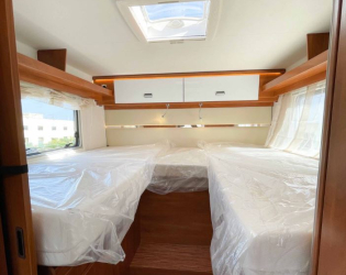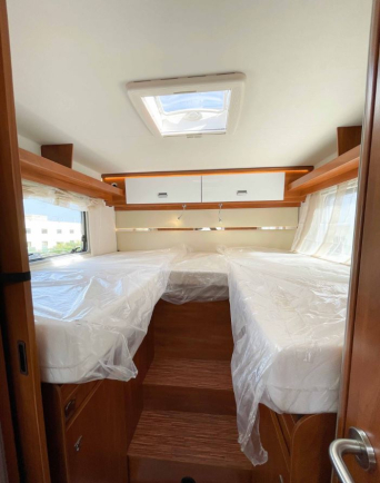 - Opuszczane łóżko z listwami i materacem o wysokim komforcie, dodatkowa markiza, okno dachowe z przezroczystą kopułą, podwójne lampki do czytania, półka i zasłonka oddzielająca dla maksymalnej prywatności