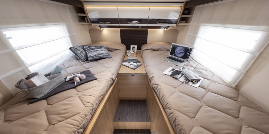 • W modelach z podwójnymi łóżkami, podnoszone podstawy łóżek z wygodnym mechanizmem tłokowym
