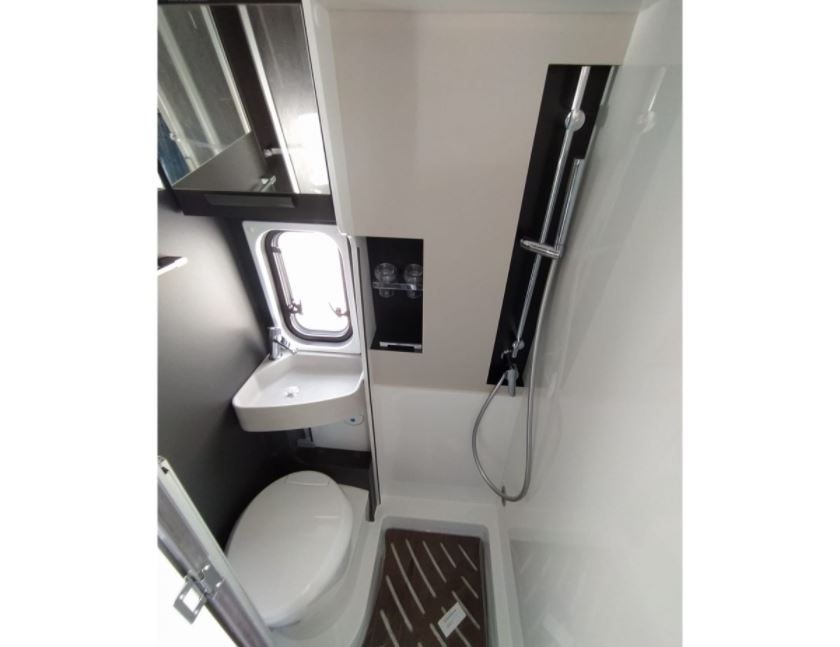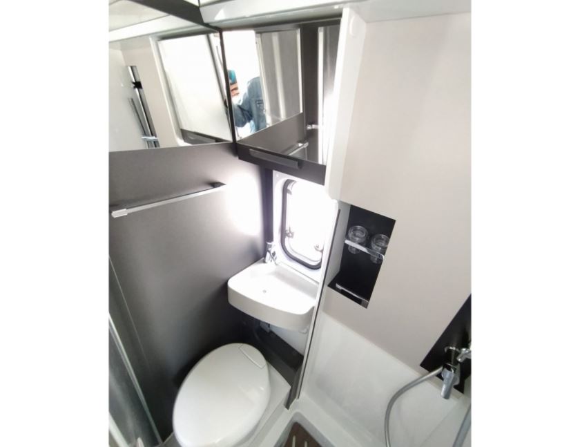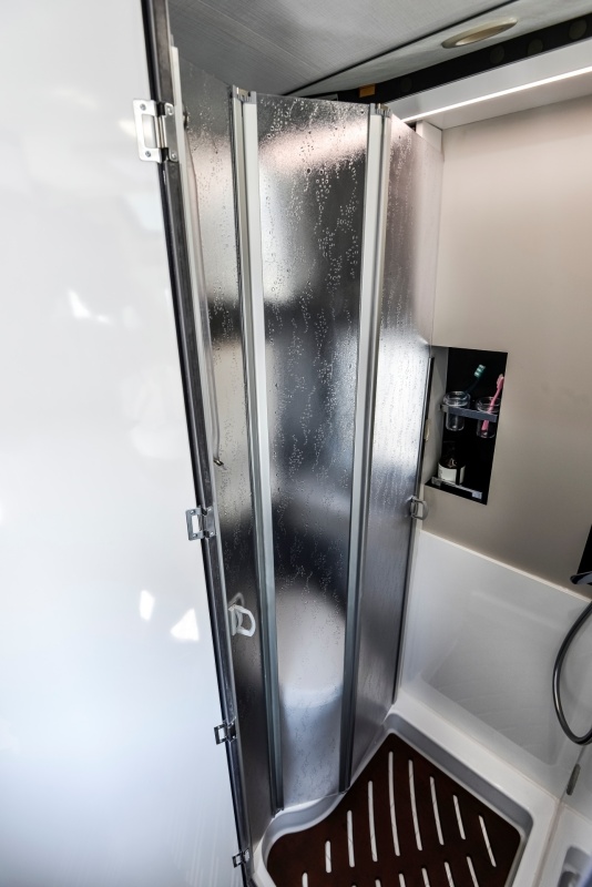 • Prysznic oddzielony sztywnymi składanymi drzwiami (zależnie od modelu)