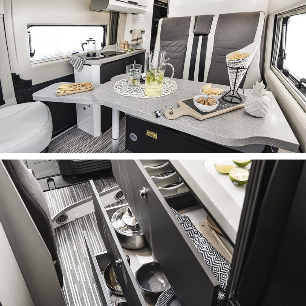 • Składany stół z kamienia akrylowego dla łatwego wsiadania i wysiadania dla kierowcy. Zdejmowany, może być również używany na zewnątrz