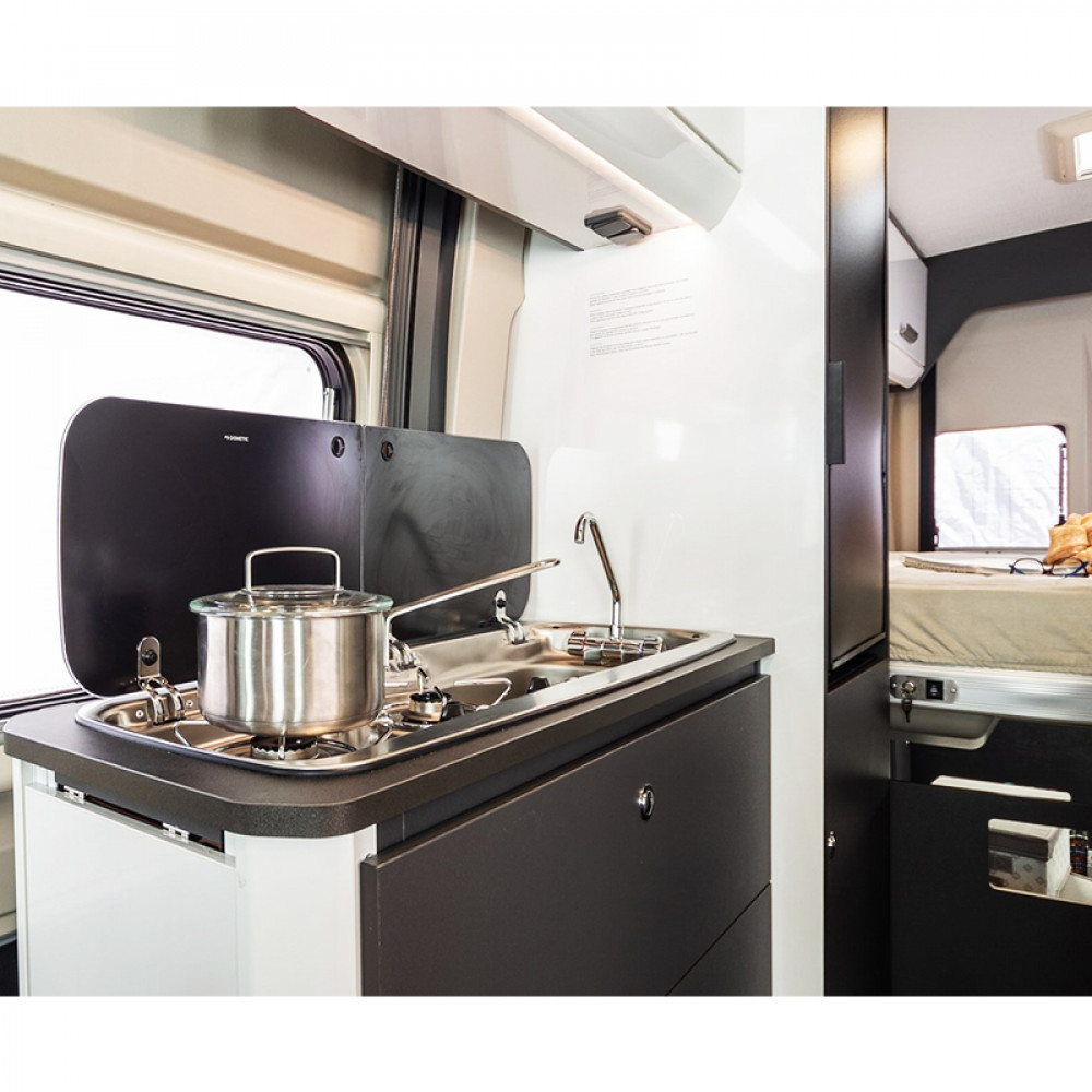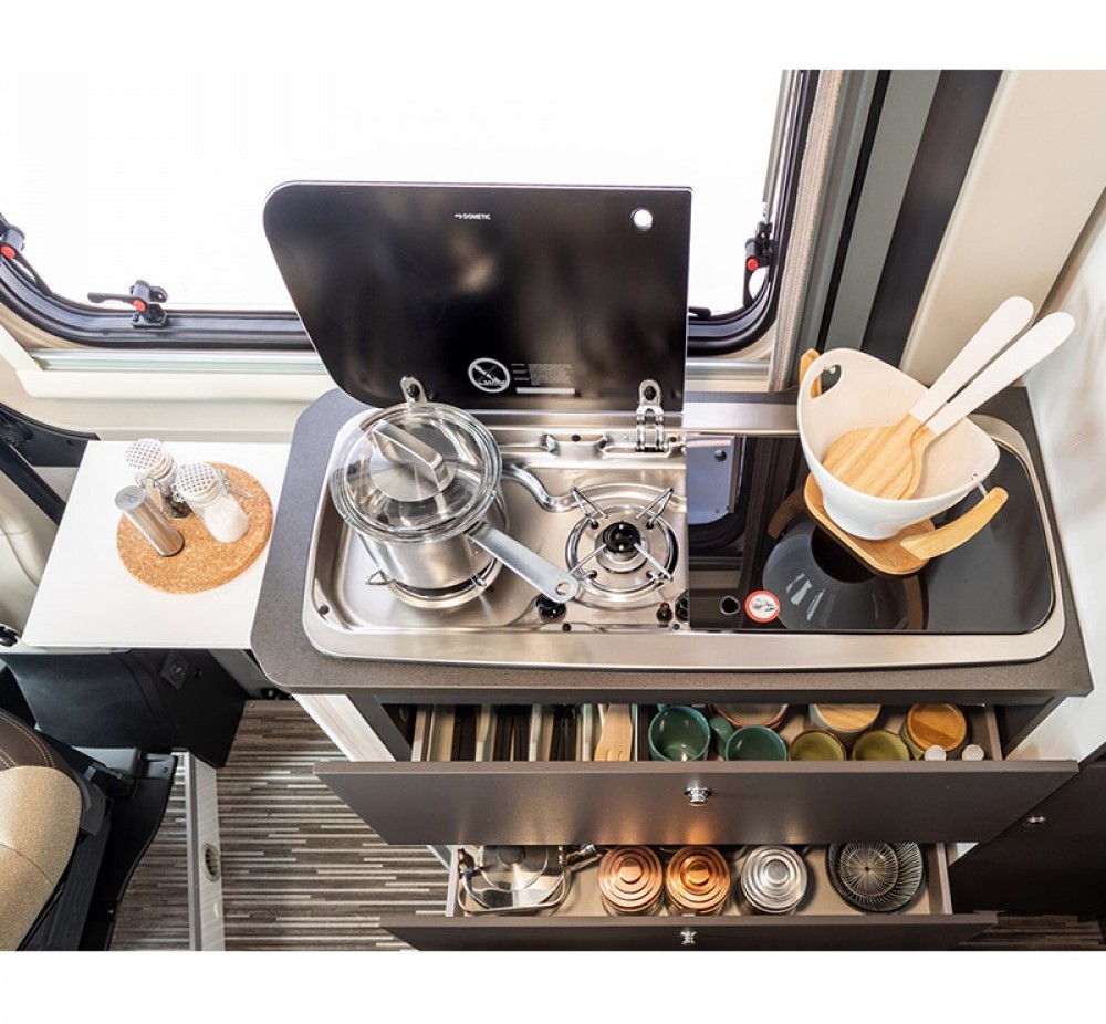 • Zintegrowany stalowy zlew z pokrywą, który może służyć jako deska do krojenia lub półka