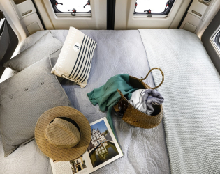 Poczucie ekskluzywności i dobre samopoczucie dedykowane Twojej intymności: odpowiednia cyrkulacja powietrza przez podwójne okno (model K 6.5) i świetlik dachowy, dodatkowa grzałka i izolacja, łóżko izolowane od schowka panelem ze sklejki morskiej.