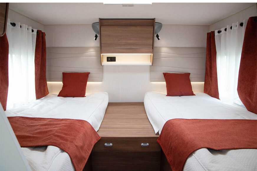 P746GJ to naprawdę przestronna półintegra, zaprojektowana z myślą o potrzebach osób poszukujących dużych wnętrz: w dużej sypialni z dwoma pojedynczymi łóżkami, oddzielnej łazience z podwójnymi ściankami działowymi, kuchni i salonie z dużymi ławami. Jej stylowe detale i wysokiej jakości wyposażenie sprawiają, że jest to idealny towarzysz podróży na krótkie wypady lub dłuższe wyprawy. Może pomieścić do 5 osób.